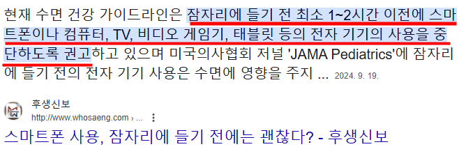 잠자기 전 1시간 동안 침대에서는 스마트폰, 컴퓨터 사용을 줄여주는 것이 좋습니다.