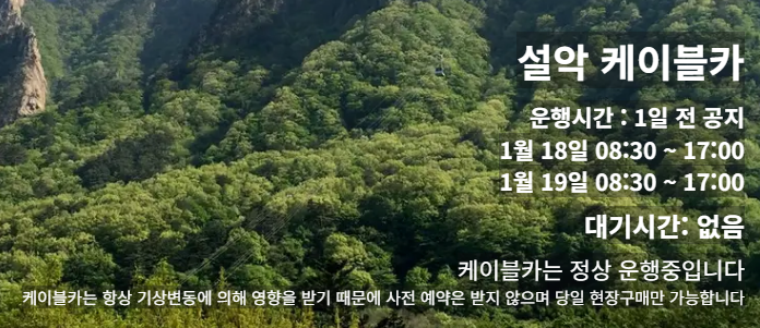 설악산 케이블카는 사전 예약이 불가능합니다. 아무래도 기상변동으로 인해 영향을 받기 때문인데요. 당일 현장구매만 가능하니, 이 점 참고하시기 바랍니다.
